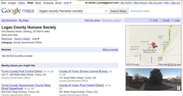The Logan County Humane Society is not a county agency, it is a 501(c)3 corporation with no association to the county. 510 Glenora is my house, nothing to do with the humane society. The nearby places in Yuma, CO – are close to 60 miles down the road, etc.