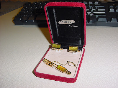 The doodads on the tie clasp and cuff links are plated versions of the highest capacity memory chip dies in the world at the time – the company had just put them into production at the time. (The curious can figure out the company by reading the silk print in the back of the box. {*grin*})
